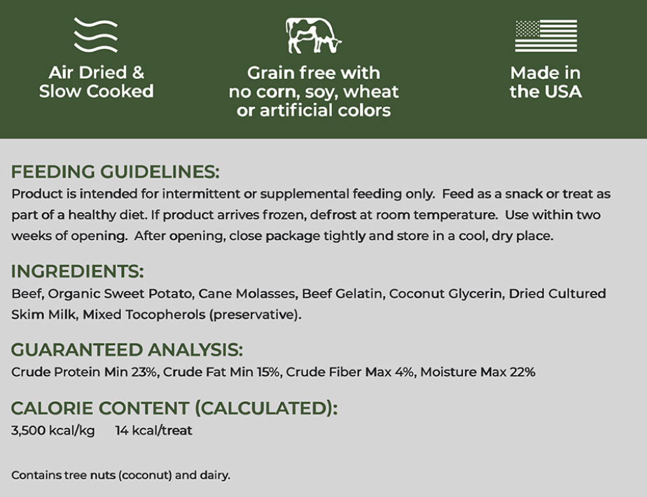 Our Beef and Sweet Potato Jerky Bites are made with 100% Grass-fed, Grass-finished Beef, Organic Diced Sweet Potatoes, and Blackstrap Molasses. These ingredients are slowly smoked in our ovens to provide a soft, delicious treat for your pup to enjoy. When your pup eats our treats, you'll know that it is better for the planet and better for them.